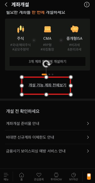 아래 이미지에 보이는 "개설 가능 계좌 전체보기" 를 선택합니다.