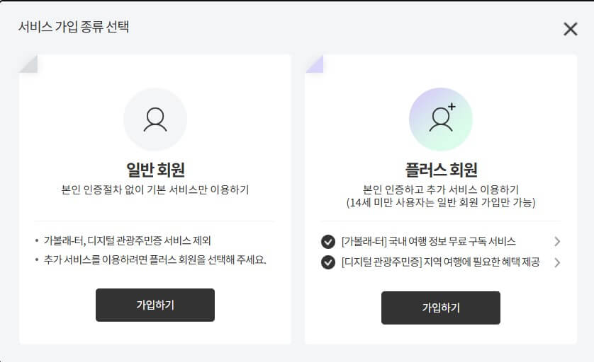5. 다음은 서비스 가입 종류에 대해서 선택해야 합니다. 디지털 관광주민증 발급을 받기 위해서는 오른쪽의 플러스 회원으로 가입을 진행하셔야 합니다. 일반회원으로 가입하시고 나중에 디지털 관광주민증을 발급받으셔도 됩니다.