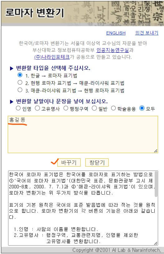 다른 변환기와 사용법은 비슷합니다. 변환하고자 하는 한글 이름을 기재하고 '바꾸기' 버튼을 클릭합니다.