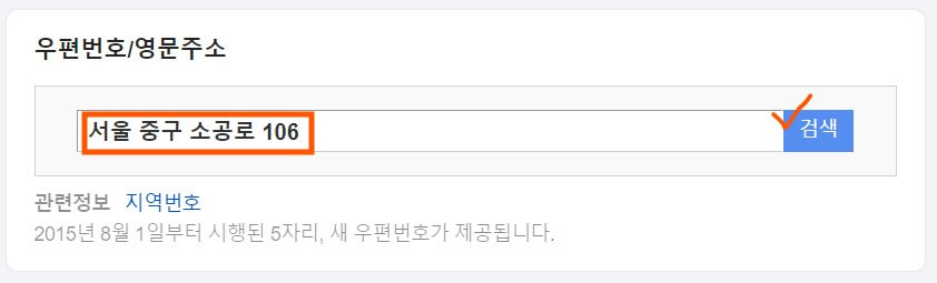 우체국 | 106, Sogong-ro, Jung-gu, Seoul, 04533, Rep. of KOREA | 동, 호수 포함시 검색이 안됨 |