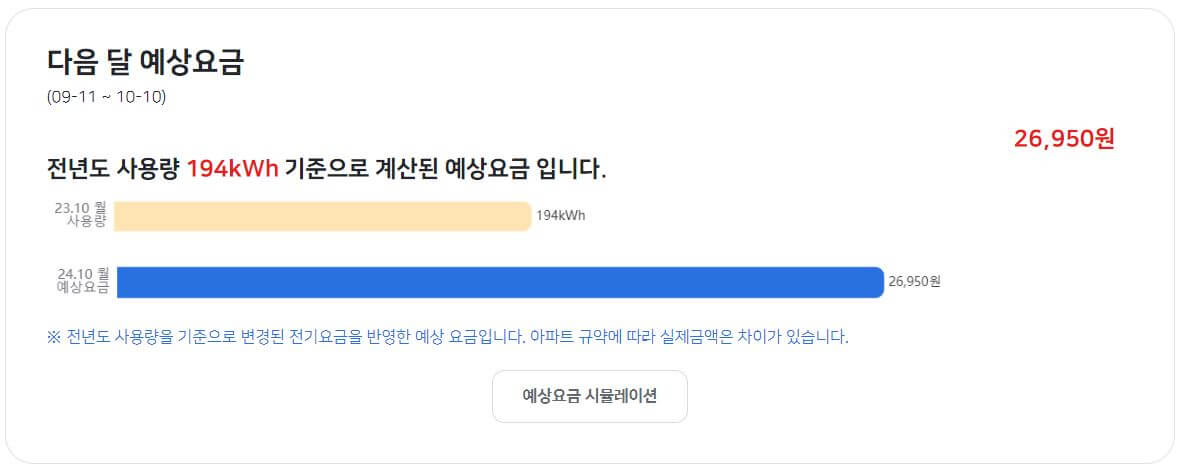 과거 전기요금은 확정 수치이지만, 당월 전기 요금은 조회일 현재기준 사용량을 바탕으로 월 환산한 추정된 예상 청구금액입니다.