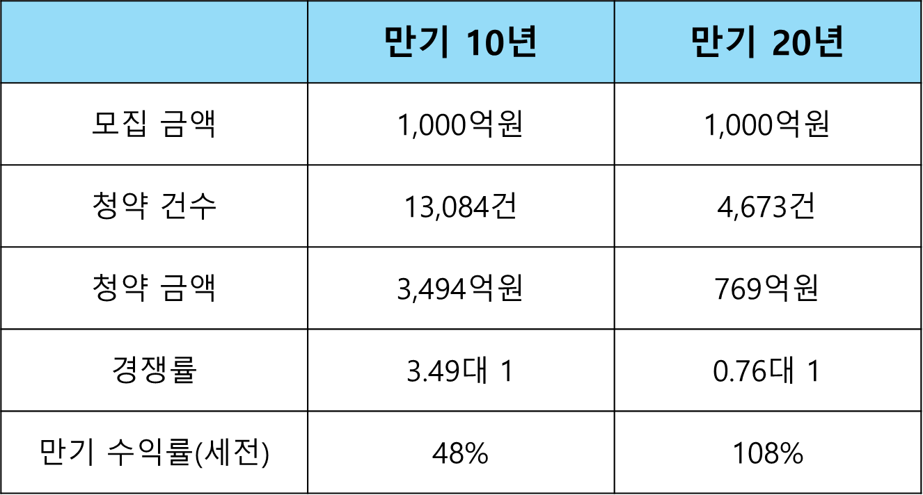 6월 13일 ~ 17일 청약 접수 결과, 청약 건수는 10년물과 20년물을 포함하여 총 17,757건이며, 청약금액은 총 4,262억 원이었습니다. 만기별 경쟁률을 보면 만기 10년물은 3.49대 1, 20년물은 0.76대1 이었습니다. 20년물 같은 경우 미달이 되었습니다.