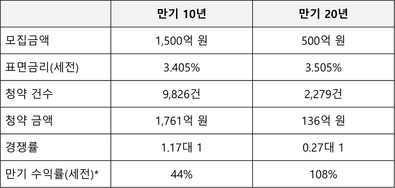 청약 금액은 배정 기준에 따라 20년물은 청약액 전액이 배정될 예정이며, 20년물 잔여 물량을 10년 물로 조정하여 최종 종목별 배정 금액은 10년물 약 1,761억 원, 20년물 136억 원입니다.